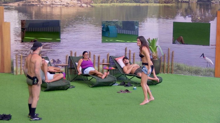 Após dias de chuva no Rio de Janeiro, faz calor na área externa do BBB 25, nesta segunda-feira (7). Depois que Delma aconselha os aliados a aproveitarem o dia, Vitória Strada faz um convite a Diego Hypolito: "Bora pegar um sol, bota uma sunguinha!".
